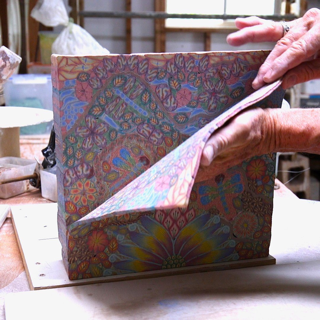Lát cắt của khối đất sét tạo thành bởi nhiều dải màu sắc được sắp xếp tỉ mỉ để tạo họa tiết mong muốn. Nguồn: Pinterest