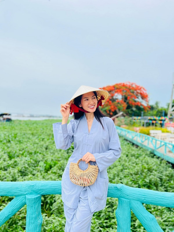 Siêu mẫu Anh Thư gây sốt với vẻ ngoài giản d với hình ảnh đội nón lá, diện trang phục áo lam.