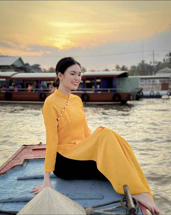 Yeye Nhật Hạ nổi bật trong tà áo dài màu vàng, nguyện cầu năm mới may mắn: “Cầu cho năm nay ngọt ngào đồ ăn miền tây. Công việc rộng rãi như tính cách người miền tây”.