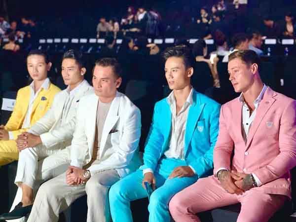 Diễn viên Vũ Đức Hải (ở giữa) – nam chính phim Trai nhảy lịch lãm trong bộ vest trắng.