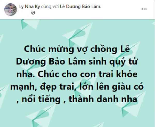 Bà xã Lê Dương Bảo Lâm vừa hạ sinh thành công nhóc tỳ thứ 3, “bà sui” Lý Nhã Kỳ cũng đã để lại lời nhắn: “Chúc mừng vợ chồng Lê Dương Bảo Lâm sinh quý tử nha. Chúc cho con trai khỏe mạnh, đẹp trai, lớn lên giàu có, nổi tiếng, thành danh nha”. Đáp lại, nam diễn viên hài hước cảm ơn “Dạ em cảm ơn chị sui. Mốt cháu lớn ẳm qua nhà chị. Chị thấy nhà nào không ở, cất cho cháu 1 căn nha chị”.