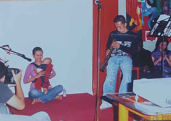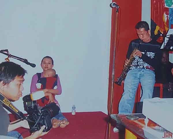 Nghệ sĩ Saxophone Xuân Hiếu (phải) phối hợp cùng nhà thơ Nguyệt Phạm trong chương trính “Trình diễn thơ” do Hội đồng Anh – British Council tổ chức tại Sài Gòn đêm 26.1.2007.