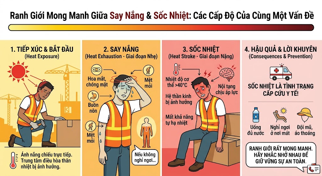 Nhiều người vẫn thường nghĩ say nắng và sốc nhiệt là hai chuyện khác nhau, say nắng thì nhẹ, còn sốc nhiệt mới là nặng. Nhưng các bác sĩ đã chỉ rõ: chúng thực chất là các cấp độ của cùng một vấn đề. Khi chúng ta làm việc hay đi lại dưới trời nắng gắt, tia nắng chiếu trực tiếp vào đầu, cổ, gáy sẽ khiến trung tâm điều hòa thân nhiệt của não bộ bị ảnh hưởng. Lúc này, nếu cơ thể không được làm mát và nghỉ ngơi ngay, tình trạng có thể nhanh chóng chuyển sang giai đoạn sốc nhiệt. Ở giai đoạn này, cơ thể gần như mất khả năng tự hạ nhiệt, dẫn đến những phản ứng rất tiêu cực cho sức khỏe.