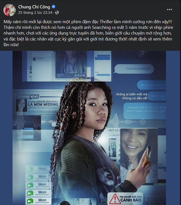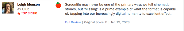 “Missing” chính là một bước đột phá của dòng phim screenlife nói riêng và thể loại giật gân nói chung của Hollywood với một cốt truyện hấp dẫn, cảm xúc xung quanh tác động cả tốt lẫn xấu của công nghệ đến cuộc sống con người.