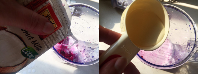 Thanh long tách bỏ vỏ, cho một nửa thịt quả thanh long vào máy xay, thêm nước cốt dừa, kem tươi và đường vào.