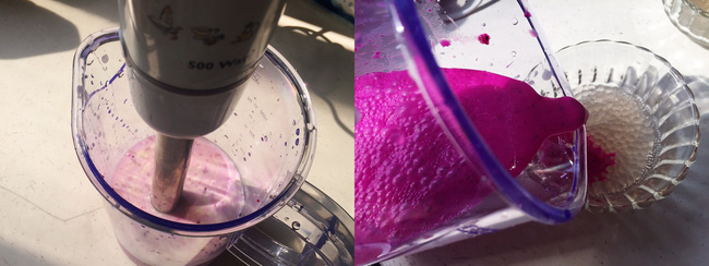 Xay nhuyễn hỗn hợp thanh long. Cho bột báng ra bát, thêm thanh long vừa xay vào. Tiếp đó cho một nửa quả thanh long còn lại thái nhỏ vào. Nếu thích ăn lạnh bạn có thể cho thêm đá hoặc để vào ngăn mát tủ lạnh.