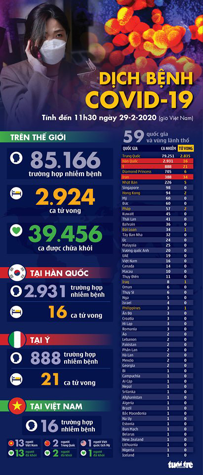 29/2, dịch Covid -19: Hàn Quốc gần 3.000 ca nhiễm, Trung Quốc 39.000 ca hồi phục.