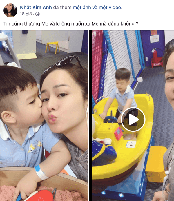 Ngay sau đó, Nhật Kim Anh cũng chia sẻ những khoảnh khắc vui vẻ bên con trai kèm theo dòng trạng thái: “Tin cũng thương mẹ và không muốn xa mẹ mà đúng không?”.