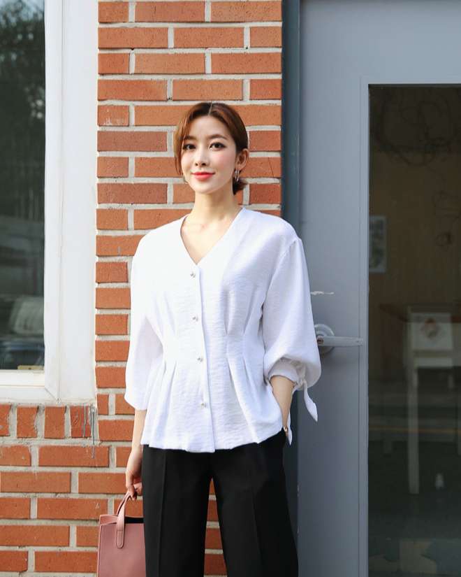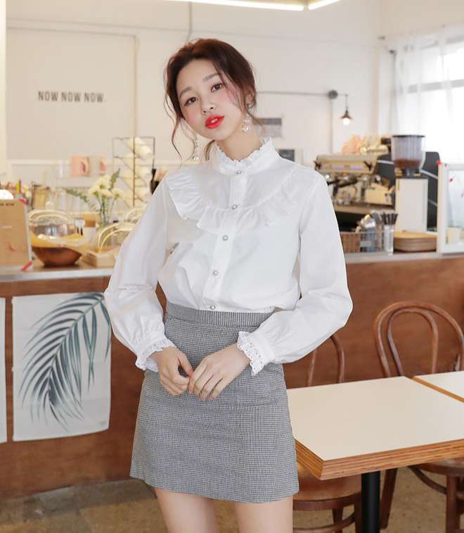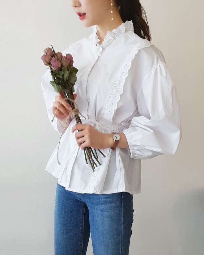 Cô nàng mê phong cách thanh lịch thì mẫu áo sơmi trắng đính ngọc trai lại là 1 gợi ý hoàn hảo. Dáng áo siết nhẹ ở eo, phần tay hơi bồng và không may cổ khiến cho mẫu áo này vừa thanh lịch duyên dáng mà vẫn có điểm trẻ trung mới lạ.