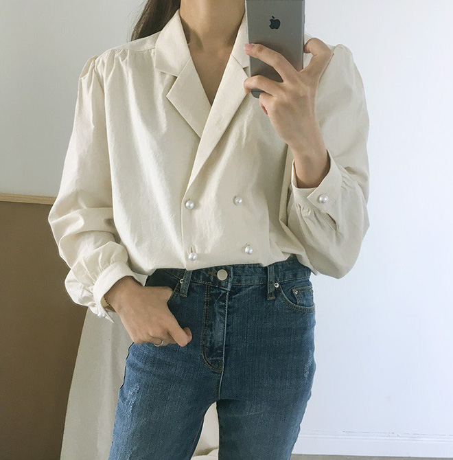 Sơmi trắng đính ngọc trai được may giả theo dáng blazer cũng là 1 gợi ý không tồi. Với dáng áo này, bạn có thể mix cùng quần jeans, quần âu hay chân váy cũng đều hợp cả.