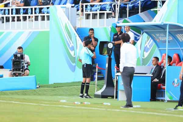 Ngó VAR. Thầy Gong Oh-kyun sốt ruột trước tình huống trọng tài cho dừng trận đấu 8 phút để xem VAR