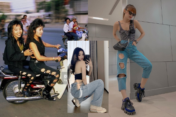 Áo hai dây crop-top, bốt da gót nhọn cùng chiếc quần táo bạo với những đường cắt xẻ lạ mắt này chính là một ví dụ điển hình cho độ “chất” không ai bì được trong phong cách thời trang người Việt xưa.