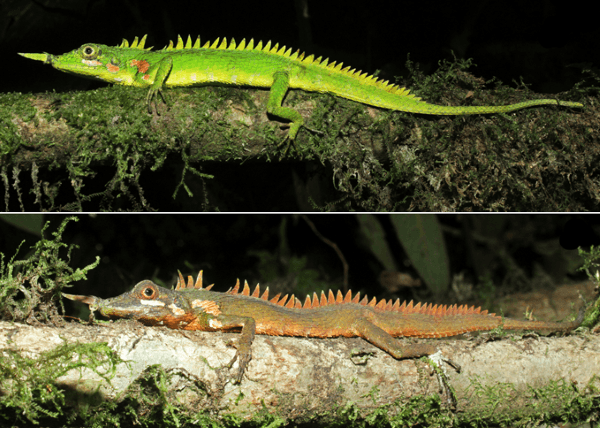Một con thằn lằn mũi sừng Modiglian thường có màu xanh lá cây và màu vàng sáng (hình trên), nhưng chúng chuyển sang màu nâu cam khi cảm thấy nguy hiểm, cần ngụy trang (ảnh dưới)