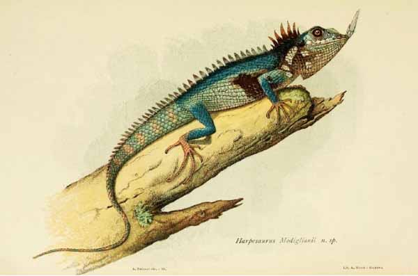 Hình minh họa con thằn lằn mũi sừng của Modiglian được thực hiện vào năm 1933 dựa trên con thằn lằn tìm thấy vào năm 1891. Mẫu vật đó chuyển sang màu xanh nhạt do cách bảo quản.