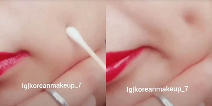 Sau đó dùng bông tăm làm mờ dấu X này, kết quả bạn có ngay một bên má lúm nhỏ xinh trên má.
