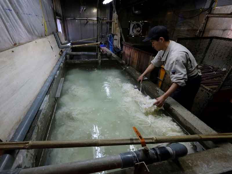Tiếp theo chính là bước tách kozo và “ướp” nó với hỗn hợp neri – loại hỗn hợp có chiết xuất từ cây hoa sunset hibiscus (một loại hoa thuộc họ dâm bụt) để tạo ra một hỗn hợp mới. Neri có tác dụng làm hỗn hợp trở nên đặc hơn.