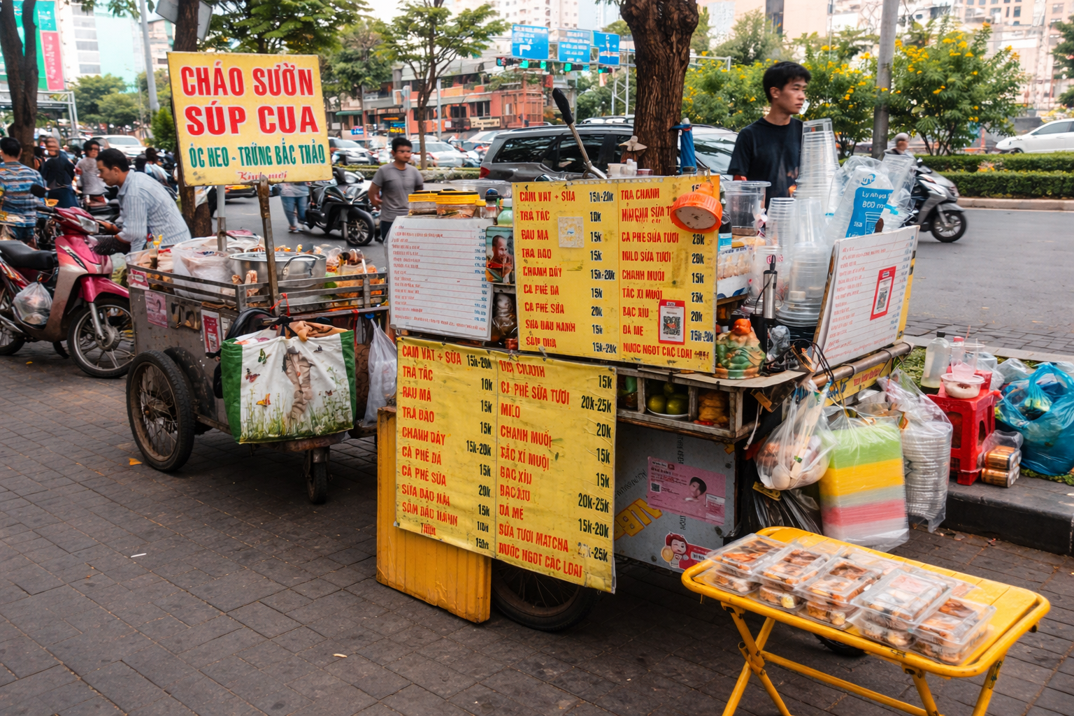 Không chỉ dừng lại ở hoạt động thả diều, khu vực này còn hấp dẫn bởi “thiên đường” ăn vặt lề đường. Dọc các tuyến đường gần đó, nhiều xe đẩy và quầy hàng nhỏ phục vụ đủ món quen thuộc như bánh tráng trộn, cá viên chiên, bắp xào, nước mía, trà tắc… Mức giá bình dân, hương vị gần gũi giúp người dân dễ dàng vừa vui chơi, vừa thưởng thức ẩm thực đường phố đặc trưng của Sài Gòn.
