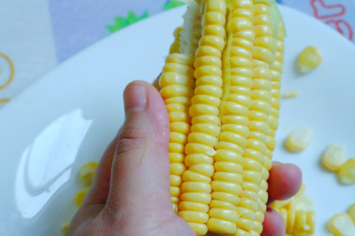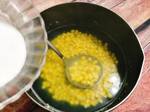 Bắp mua về rửa sạch rồi dùng dao tách lấy hạt, phần lõi bắp giữ lại để nấu nước rau câu cho ngọt và thơm tự nhiên. Bạn cho hạt bắp và phần lõi vào nồi nấu cùng với nước. Khi bắp đã chín thì vớt bỏ phần lõi ra. Hòa bột rau câu với đường vào một âu nhỏ, trộn đều.