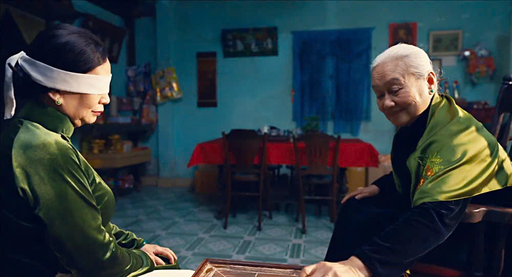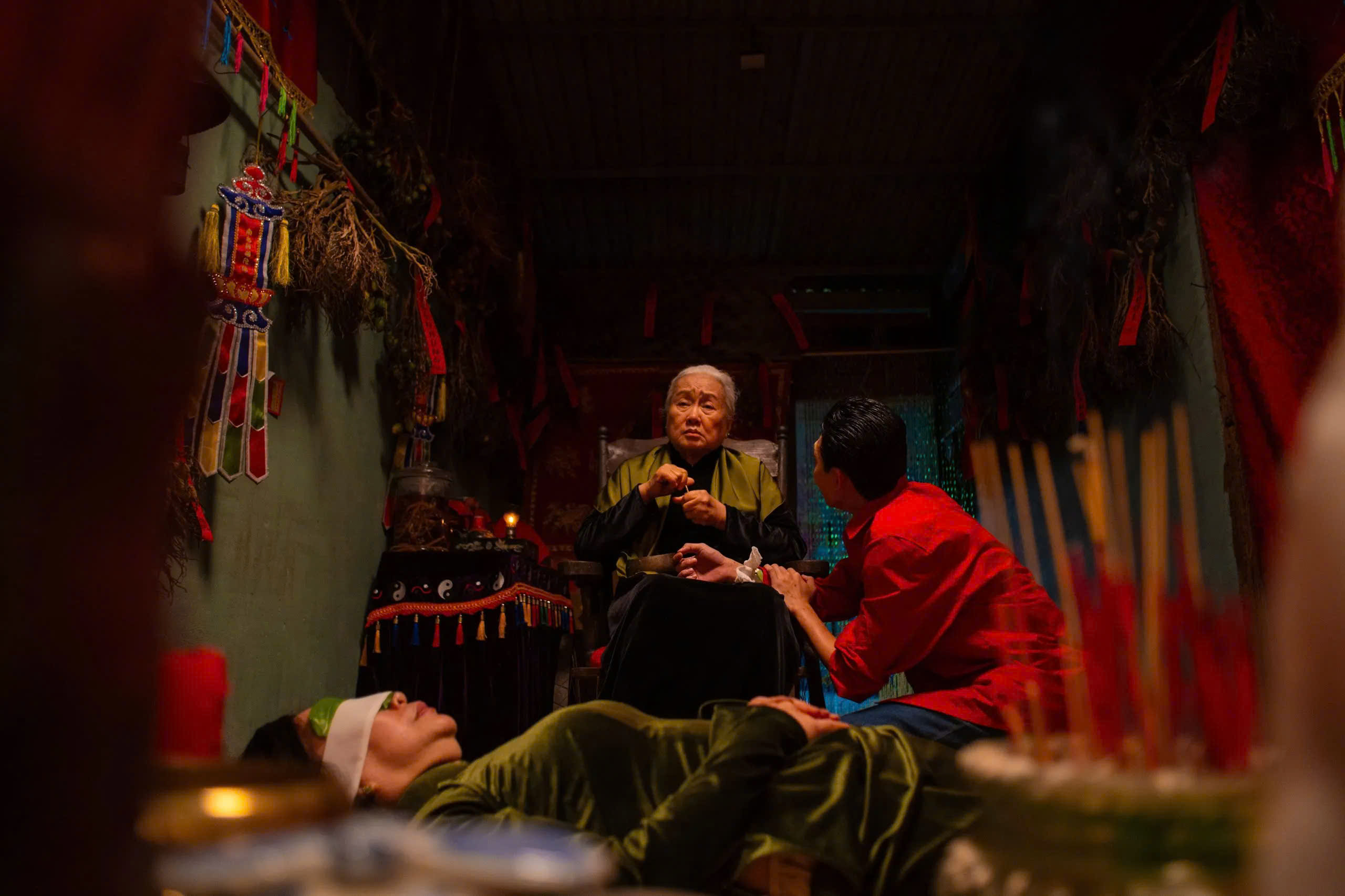 Gam màu đất nung phối cùng ánh sáng mờ ảo, tạo nên không gian vừa cổ kính vừa ngột ngạt như kéo người xem vào chính thế giới mê tín của nhân vật.