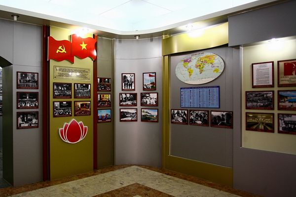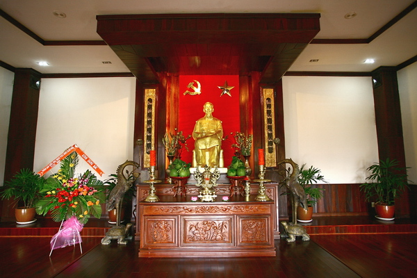 Không gian tưởng niệm chủ tịch Hồ Chí Minh lối sảnh chính. Trên án thờ có tượng Bác Hồ bằng đồng, tay cầm tờ báo nhân dân. Hai bên án thờ là câu đối: “Đoàn kết, đoàn kết, đại đoàn kết/ Thành công, thành công, đại thành công”.