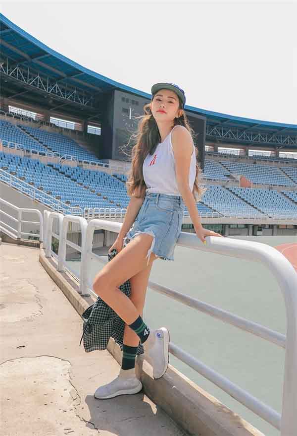 Bộ đôi kết hợp cực ngầu và nổi bật gọi tên áo tank top và chân váy denim. Bạn chỉ cần chọn thêm một chiếc nón lưỡi trai cùng màu chân váy hoặc cùng màu áo để trông “cool” hơn!