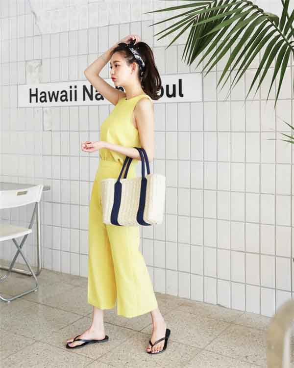 Nếu bạn yêu thích phong cách nữ tính, hãy nghĩ đến việc sắm một set áo 2 dây – quần lửng matchy-matchy như thế này. Set đồ này có rất nhiều ưu điểm: mát mẻ, thanh lịch, dễ mặc, không tốn công mix&match. Bạn có thể thả áo tự nhiên hoặc sơ-vin đều đẹp.