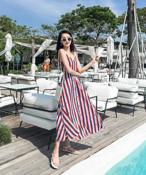 Một cái tên quen thuộc không thể thiếu trong list đồ đi chơi chính là váy maxi dài thướt tha. Họa tiết kẻ sọc được coi là cứu tinh cho các cô nàng có khuyết điểm cơ thể như không cao hay không thon gọn. Thêm khoảng hở lưng và vai thêm phần quyến rũ, gợi cảm, xứng đáng điểm 10 trong mọi shoot hình.