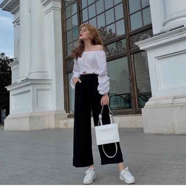 Crop top kết hợp với quần âu ống rộng là combo được nhiều bạn trẻ ưa chuộng vì dễ phối đồ đồng thời che được cả vòng bụng mỡ thừa. Ngoài ra, áo bẹt vai tay bồng chun nhún là lựa chọn lên đồ sáng suốt với những nàng có bắp tay kém thon lại vừa giúp trẻ xinh, nữ tính.