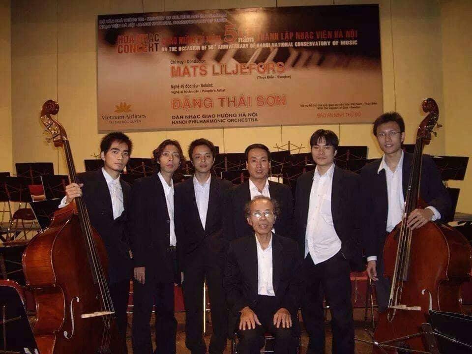 Nhạc sĩ Nguyễn Quyết Thắng, giáo viên Xen-lô và các thế hệ học sinh của mình đào tạo tại Nhạc viện Hà Nội. (Ảnh gia đình cung cấp)