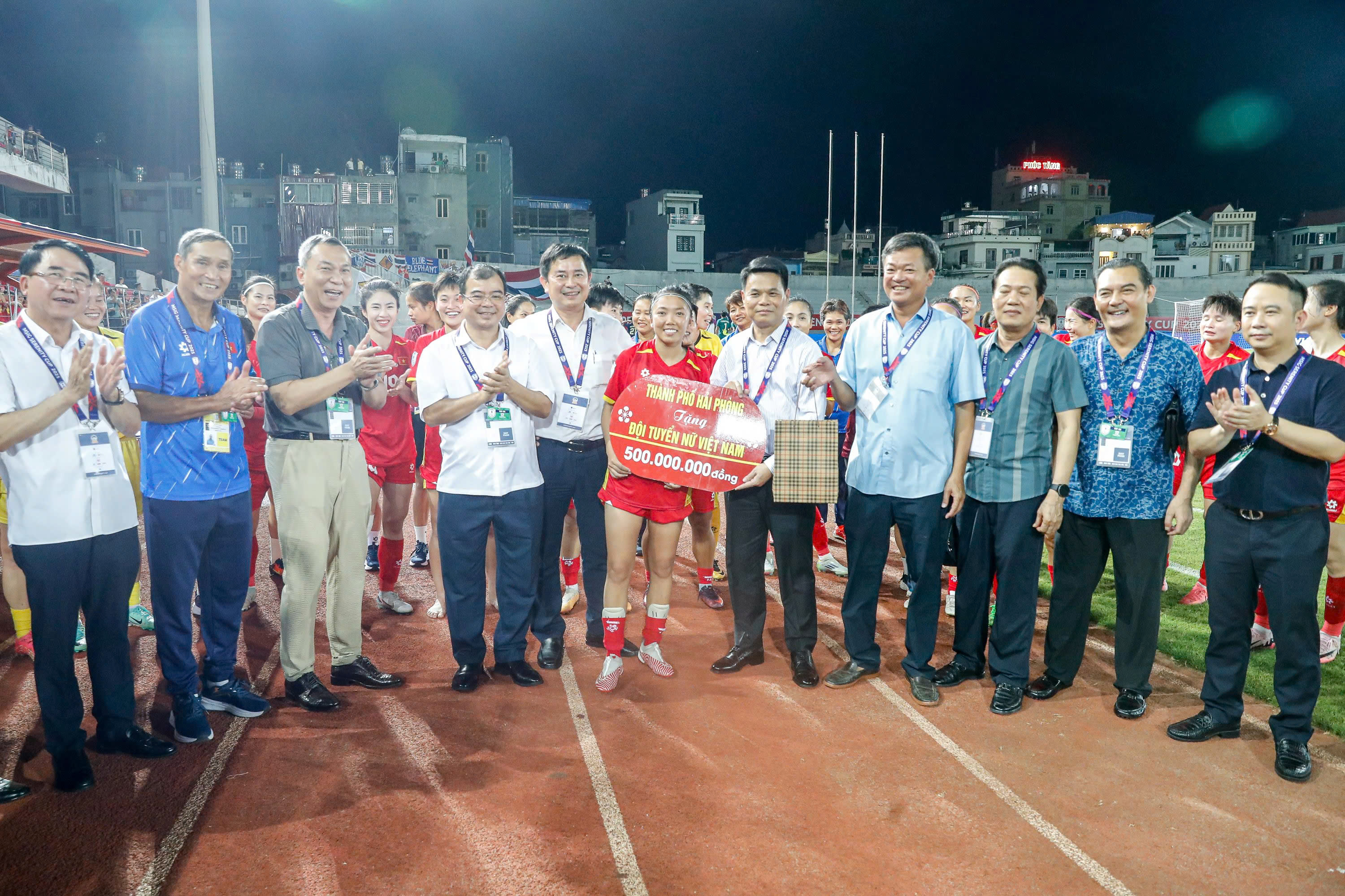 Lãnh đạo TP. Hải Phòng và LĐBĐVN đã trực tiếp xuống sân chúc mừng thành tích bước vào bán kết của đội bóng. Ảnh: VFF