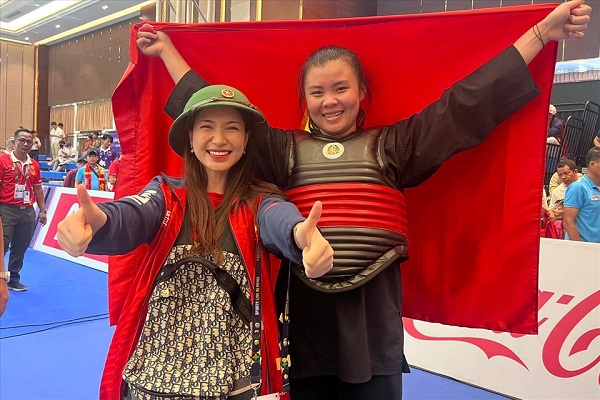 Hình ảnh Hòa Minzy đến cổ vũ tinh thần các VĐV Pencak Silat Việt Nam, nhanh chóng đội chủ nhà ẳm tù tì 4/5 Huy chương vàng.
