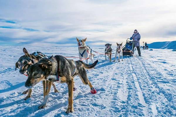 Đi xe trượt tuyết bằng chó Huskies kéo
