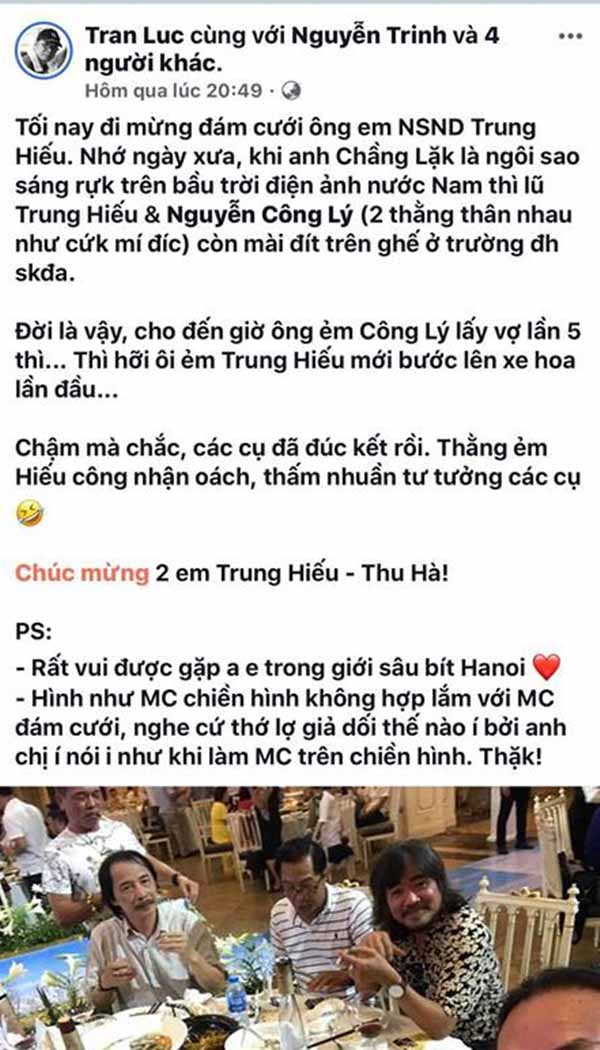 “Hôm qua cưới Đại Ca “Lý Thông” của tôi, NSND Trung Hiếu. Từ SG bay ra định chỉ để chúc mừng cho ông anh thôi, nhưng ông anh gọi điện bảo: “Thôi làm chủ hôn với chị Thảo Vân cho anh nhé!”.