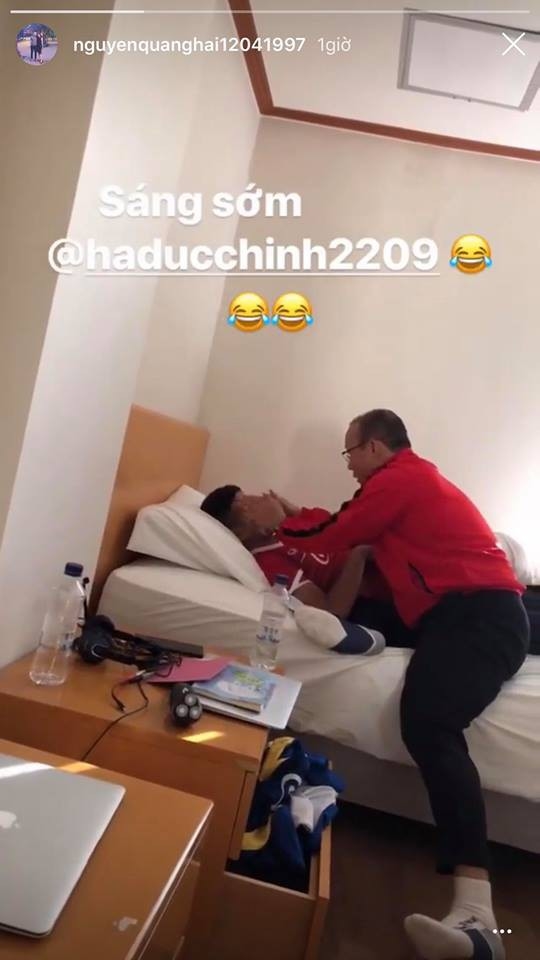 Theo hình ảnh được đăng tải, HLV Park Hang-seo đã sang tận phòng của Hải và Chinh để tự tay đắp mặt nạ cho 2 học trò “cưng” của mình. Sau đó, 2 cầu thủ đã cùng nhau selfie, khoe chiến tích được thầy Park đắp mặt nạ thành công.
