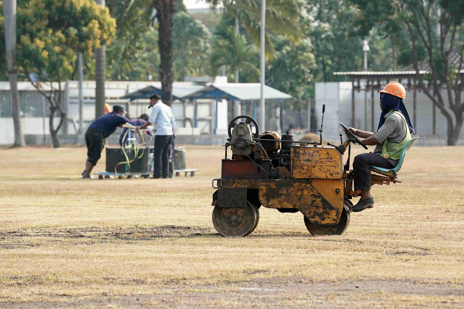 Đồng thời, các ống nước đã được trải khắp xung quanh mặt sân để tưới nước làm mềm sân cũng như tươi lại lớp cỏ héo úa lâu ngày dưới cái nắng gay gắt tại Cikarang.