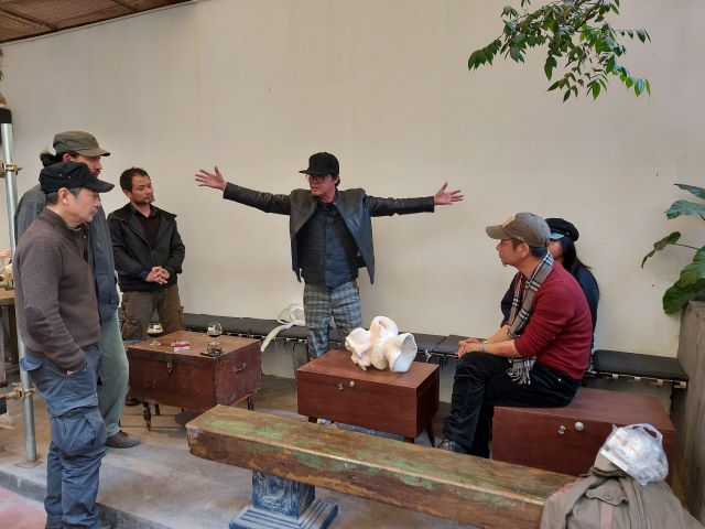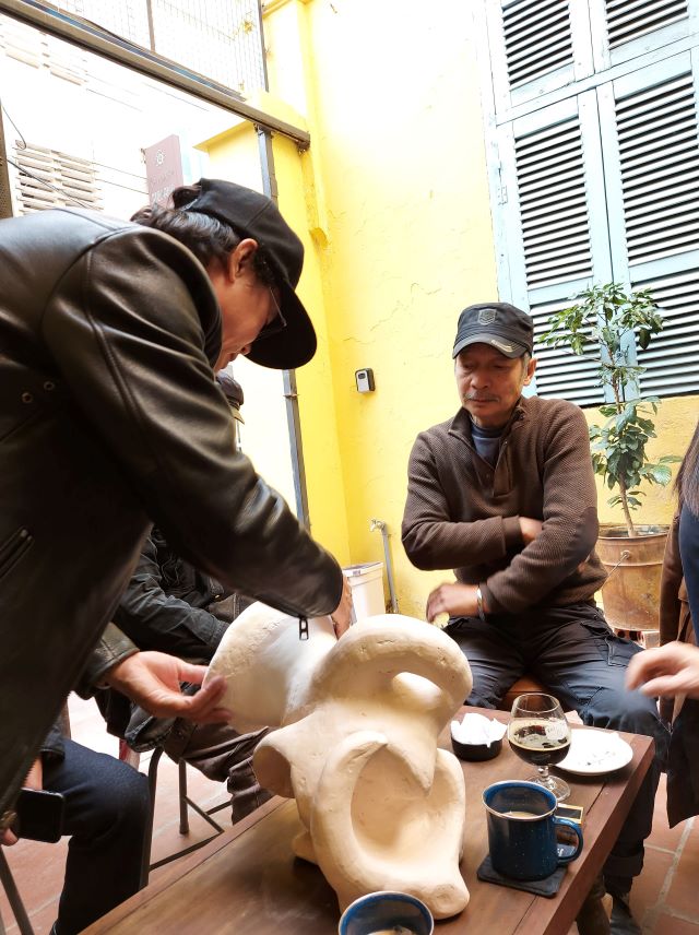 Họa sĩ Đinh Phong trong một lần nói chuyện về điêu khắc với bạn đồng nghiệp tại Hà Nội, 1.2021.