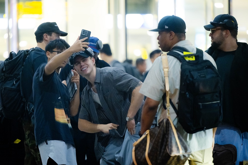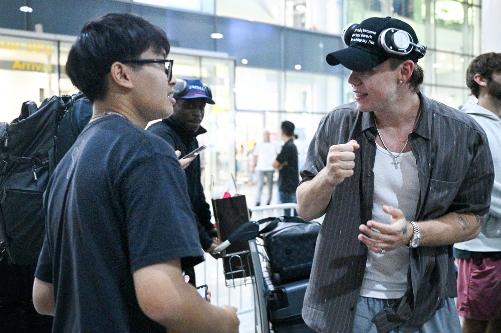 The Kid LAROI cùng êkíp 4 người đáp chuyến bay xuống sân bay Nội Bài lúc 21h55. Mặc dù trải qua một chuyến bay dài khá mệt mỏi, ngôi sao trẻ nước Úc vẫn gây ấn tượng với vẻ ngoài thân thiện, gu thời trang khỏe khoắn, năng động, trẻ trung. Trên đầu anh đeo tai nghe bluetooth không dây cá tính như một lời khẳng định “tôi đây người hệ nhạc”.