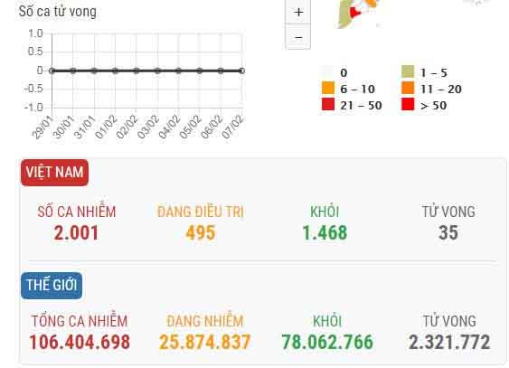 – 1 trường hợp (BN2001) là F1 BN1711, liên quan đến ổ xã Lê Ninh, huyện Kinh Môn, tỉnh Hải Dương, đã được cách ly tập trung ngày 29.1.2021. Kết quả xét nghiệm lần 1 ngày 30.1.2021 là bệnh nhân âm tính với SARS-CoV-2. Kết quả xét nghiệm lần 2 ngày 7.2.2021 bệnh nhân dương tính với SARS-CoV-2. Hiện bệnh nhân đang cách ly, điều trị tại Bệnh viện dã chiến Trường Đại học Kỹ thuật Y tế Hải Dương.