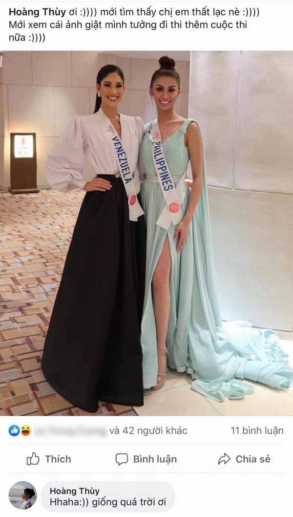 Cụ thể, khi hình ảnh của hai cô nàng này được đăng tảu, người hâm mộ Việt để lại rất nhiều bình luận cho rằng cô đại diện đến từ Philippines rất giống với Lâm Khánh Chi từ góc mặt, nụ cười,… của mỹ nhân này đều khiến bức ảnh được chú ý trên mạng xã hội. Bên cạnh đó, người đẹp đến từ Venezuela lại rất giống Hoàng Thùy từ thần thái đến ánh mắt. Đến Hoàng Thùy cũng phải kinh ngạc vì có một người giống mình đến vậy khi nhìn thấy hình ảnh này. Khoảnh khắc Lâm Khánh Chi và Hoàng Thùy đọ sắc ở một cuộc thi Hoa hậu khiến công chúng vô cùng thích thú.