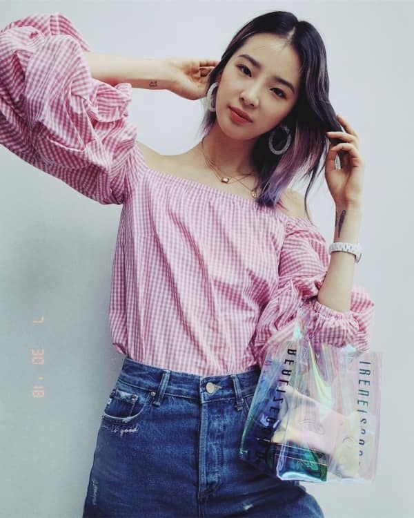 Irene Kim là một trong những fashionista nổi tiếng trên Instagram với 1,2 triệu người follow. Cũng lựa chọn áo trễ vai tay bồng để chưng diện nhưng cô lại mặc một thiết kế họa tiết kẻ gingham nổi bật thay vì kiểu áo trơn màu quen thuộc. Bên cạnh đó, cô cũng sử dụng thêm phụ kiện là túi nhựa trong suốt để làm điểm nhấn cho phong cách thêm nổi bật hơn.