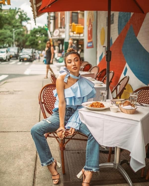 Jessica Wang lăng xê xu hướng nhún bèo điệu đà – một trong những xu hướng đang được khá nhiều tín đồ thời trang yêu thích. Lựa chọn mẫu áo nhún bèo lệch vai màu xanh pastel, cô mix item này cùng quần jean rách gấu, thêm phụ kiện đi kèm là sandals đế thô hot trend.