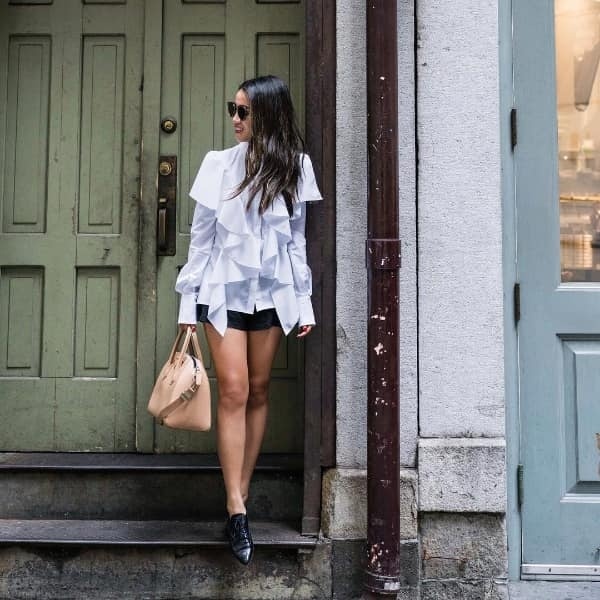 Cũng đi theo trào lưu nhún bèo, Wendy Nguyễn lại lựa chọn một mẫu áo blouse tông trắng để kết hợp cùng quần short và phụ kiện là túi xách to bản và giày đế bệt.