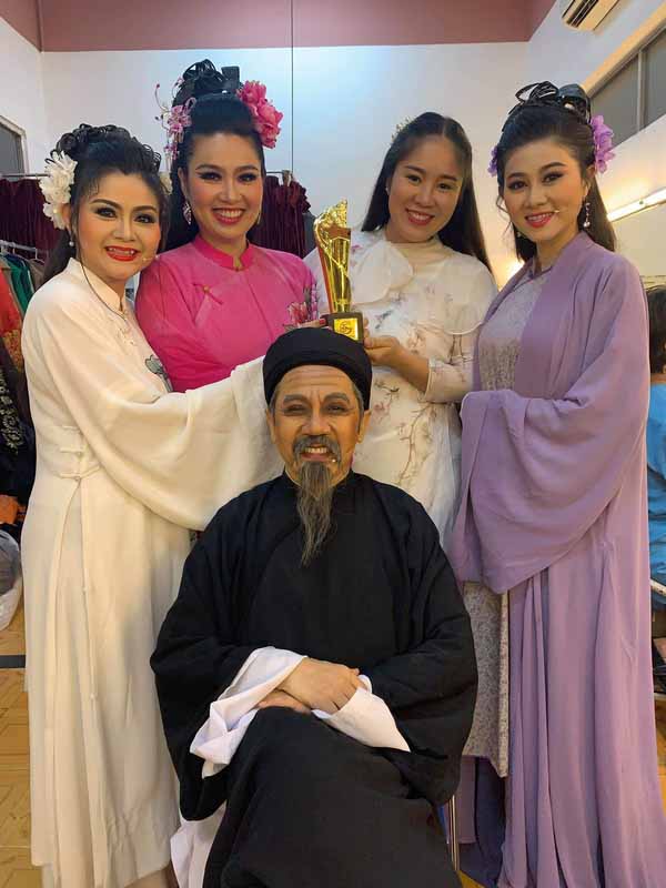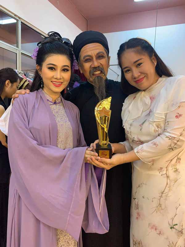 Lê Phương bên nghệ sĩ Thành Lộc, Quế Trân ở hậu trường vở diễn
