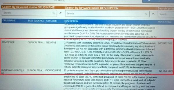 Ngoài remdesivir, danh sách thuốc thử nghiệm điều trị COVID-19 còn có avigan chữa cúm; hydroxychloroquine cùng chloroquine chữa sốt rét, lupus, viêm khớp dạng thấp; kháng sinh azithromycin; thuốc viêm khớp actemra; vài loại thuốc kháng HIV và thuốc chữa viêm gan C.