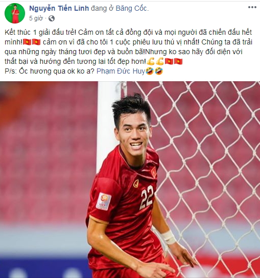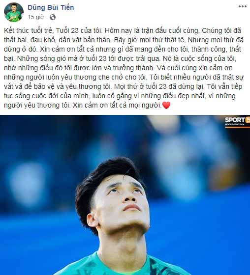 Chia sẻ cùng người hâm mộ trên trang cá nhân, anh không khỏi buồn bã: “Kết thúc tuổi trẻ, Tuổi 23 của tôi. Hôm nay là trận đấu cuối cùng, chúng tôi đã thất bại, đau khổ, dằn vặt bản thân. Bây giờ mọi thứ thật tệ, nhưng mọi thứ đã dừng ở đó”.