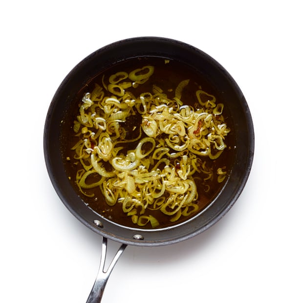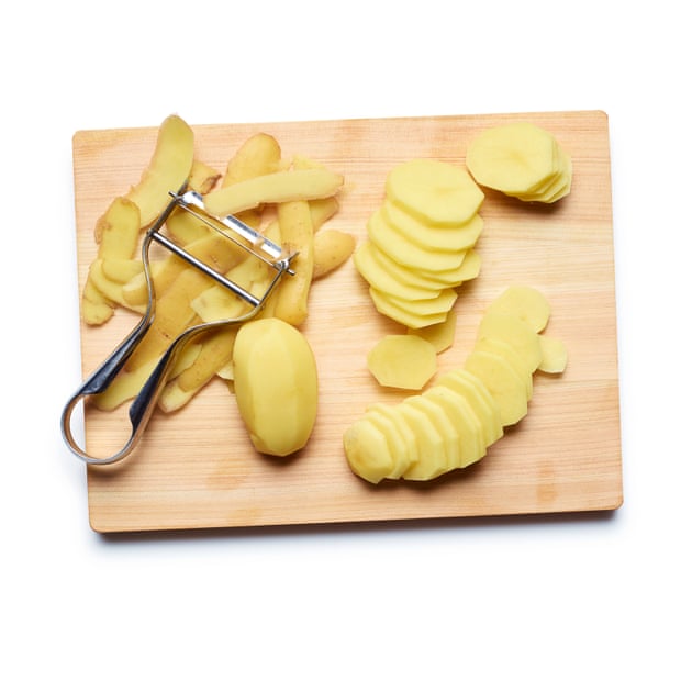 Tiếp theo đó, chuẩn bị khoai tây. Gọt vỏ và cắt lát mỏng. Rửa các lát khoai tây trong nước lạnh, sau đó thấm khô bằng khan hoặc giấy sạch trước khi cho vào chảo hành tây; nếu chảo quá đầy, chia nhỏ ra làm từng phần. Nấu cho đến khi khoai tây mềm và gần như nứt vỡ.