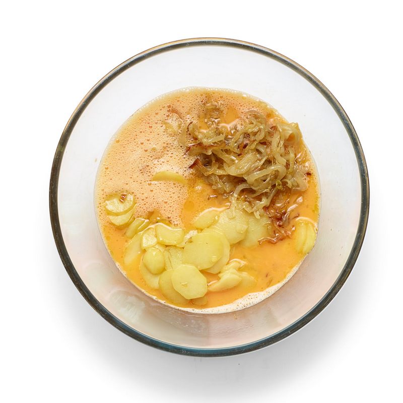 Để chảo nguội một chút, lấy phần khoai tây và hành ra. Giữ lại phần dầu còn thừa để làm phần trứng tráng. Đập trứng vào tô lớn, đánh đều, nêm gia vị, sau đó cho hành tây và khoai tây đã xào chín vào. Để yên trong 10 phút, hoặc lâu hơn, nếu thích hương vị hành tây được ngấm thấm vị hơn.