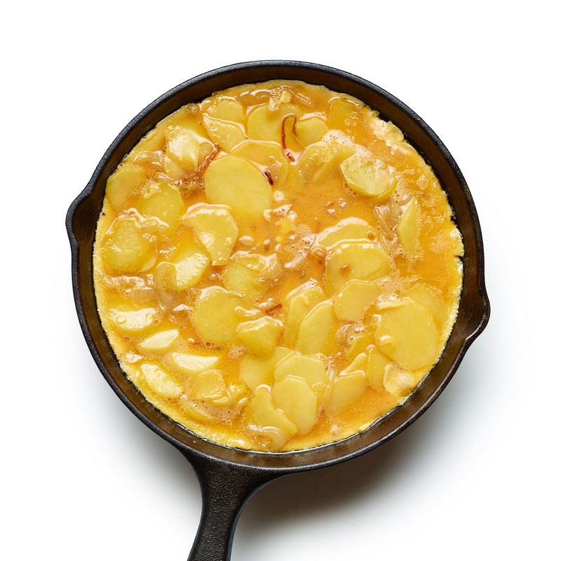 Đặt lên bếp một chảo nhỏ, đường kính khoảng 22cm, bật lửa vừa và thêm ít dầu ô liu nguyên chất (hoặc sử dụng lượng dầu còn thừa ban nãy). Khi chảo đã nóng, cho hỗn hợp trứng và khoai tây vào và chiên cho đến khi phần đế giòn.