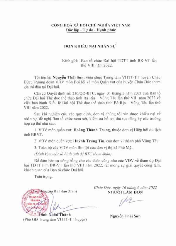 Sau khi Thanh Niên đăng tải bài viết “Bi hài nhà vô địch taekwondo tỉnh BR-VT không biết nhà mình ở đâu”, phản ánh đoàn TX.Phú Mỹ đã đưa các VĐV ở tỉnh, thành phố khác về thi đấu môn taekwondo tại Đại hội Thể dục Thể thao tỉnh BR-VT năm 2022 để đạt thành tích cao thì nhiều đoàn thể thao khác đã “tố cáo” chuyện đoàn TX.Phú Mỹ đã làm điều tương tự ở những bộ môn khác. Thậm chí đã có những đơn khiếu nại được viết từ tháng 6.2022.