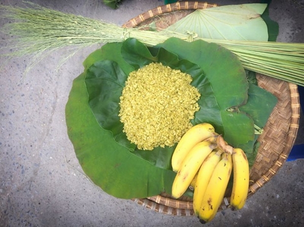 Cốm được ăn kèm chuối chín trứng quốc tạo nên hương vị rất riêng.